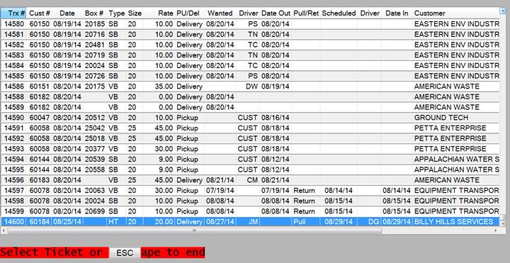 Choosing “V” at the ticket number will create a display of the existing tickets that are still open. You can choose any of these tickets and edit, print, or delete the ticket.